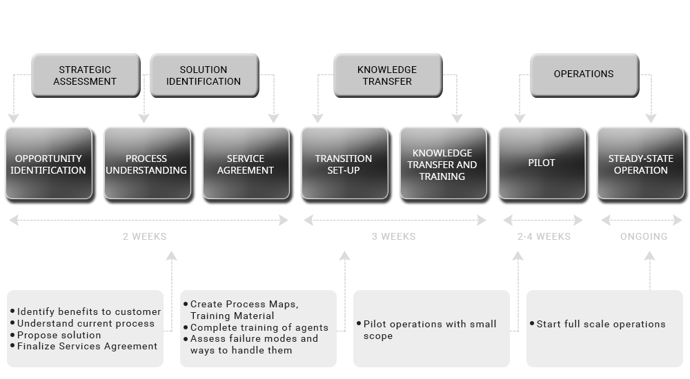 We have a comprehensive and mature transition methodology that has been refined and documented during the course of several transitions. Compliance is monitored through check points at different stages. We believe that a well-managed transition provides a robust foundation for a stable operation across the outsourcing cycle.